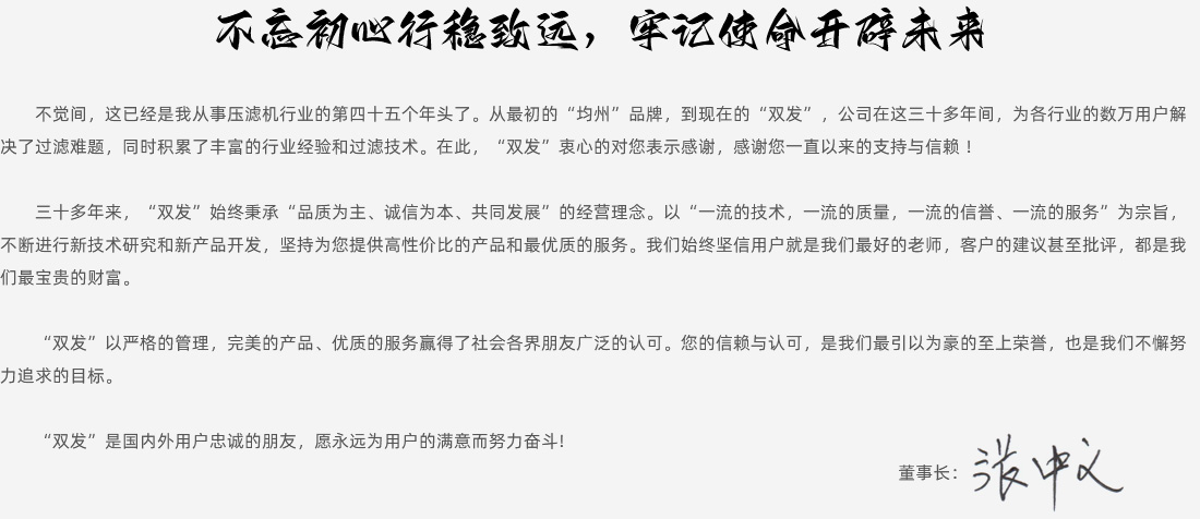 “濾污水為清泉,變污泥為凈土,還廢礦渣為青山綠地”,誠信塑品牌,質(zhì)量出名牌。三十多年來,“雙發(fā)”始終秉承“品質(zhì)為主、誠信為本、共同發(fā)展”的經(jīng)營理念。以“一流的技術,一流的質(zhì)量,一流的信譽、一流的服務”為宗旨。不斷進行新技術研究和新產(chǎn)品開發(fā),堅持為用戶提供高性價比的產(chǎn)品和最優(yōu)質(zhì)的服務。